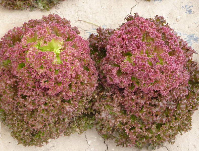 叶片皱曲,紫红色,色泽美观,叶片长椭圆形,茎极短。喜光照及温和气候,适应性强。口感好。