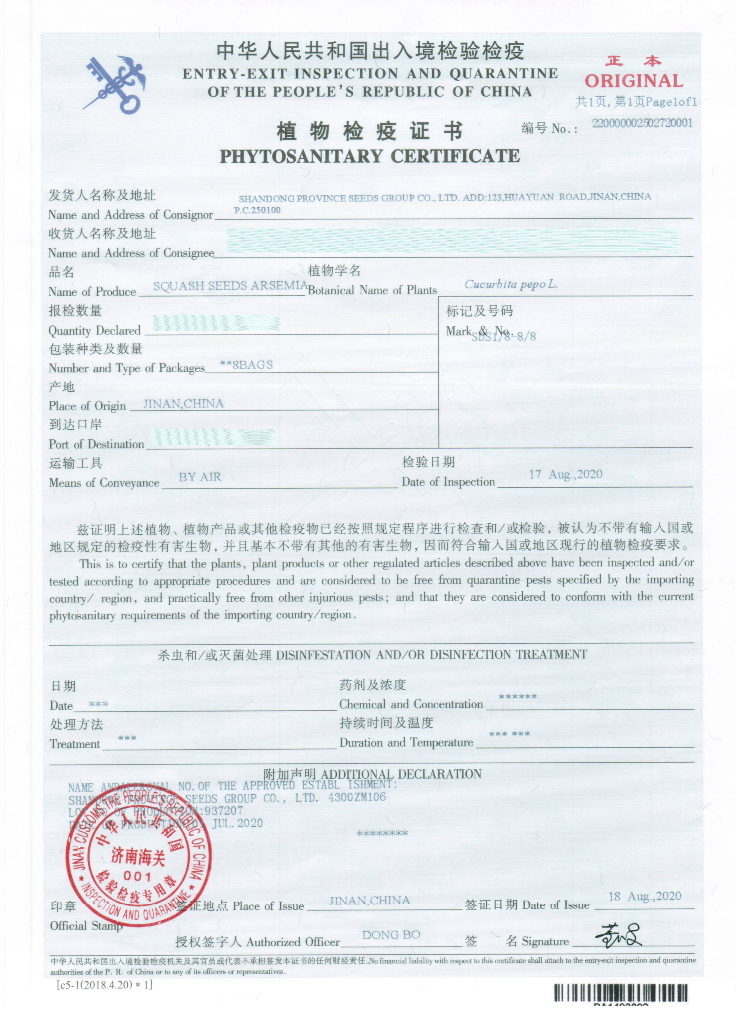 18 August 2020, Jinan Customs issued the first exit crop seed plant quarantine certificate in Jinan, which opened up the export of crop seeds in Jinan customs. Shandong seed Co., Ltd. Is the earliest enterprise to carry out crop seed export in Shandong Province. The issuance of this certificate marks the official departure of Shandong seed varieties from Jinan and benefits the world.
