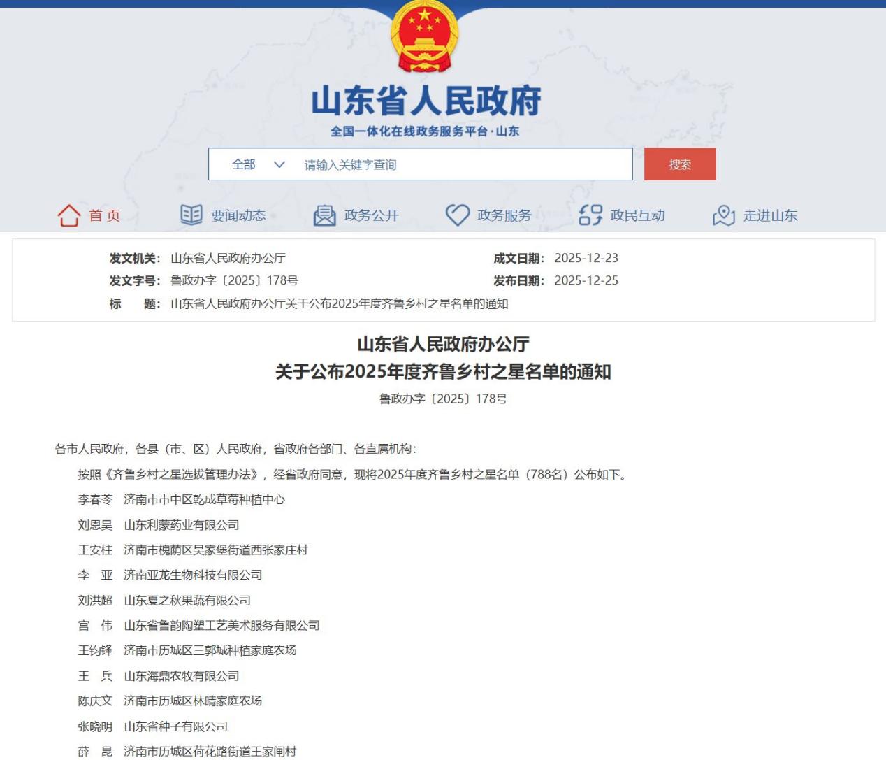 Recently, the General Office of the People's Government of Shandong Province announced the list of "Qilu Rural Stars" for 2025, and Zhang Xiaoming, CEO of Shandong Seed Co., Ltd., was awarded the honorary title of "Qilu Rural Star". This honor aims to recognize exemplary individuals who have made outstanding contributions to promoting rural revitalization and accelerating the modernization of agriculture and rural areas.